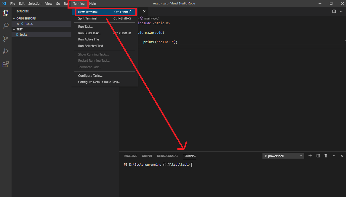 5. 터미널을 엽니다. 이것은 window cmd와 같습니다.