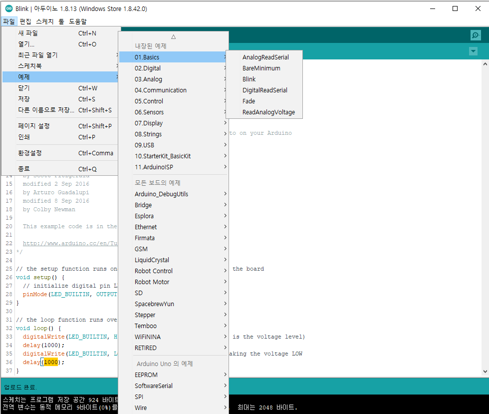 아두이노 IDE를 설치하게 되면 다음과 같은 기본 예제 소스를 지원하고 있습니다.