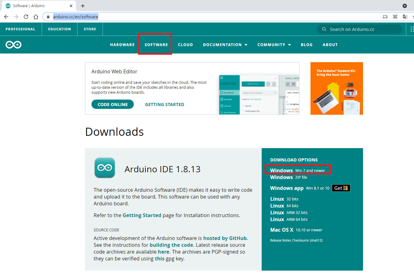 아두이노 공식 사이트입니다.(www.arduino.cc/en/software)