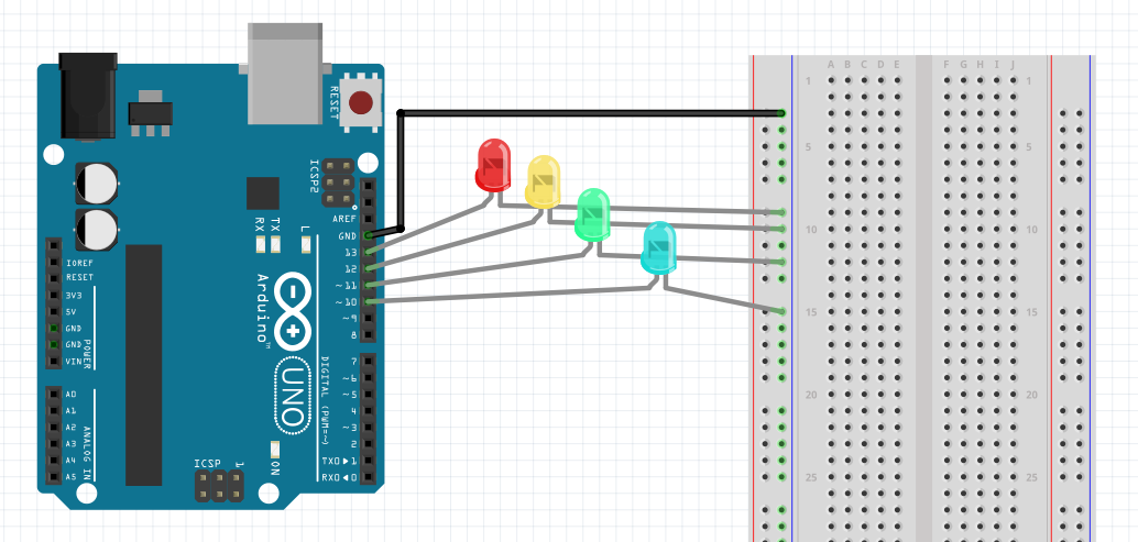 4개의 LED를 13~10 번 포트에 연결합니다.