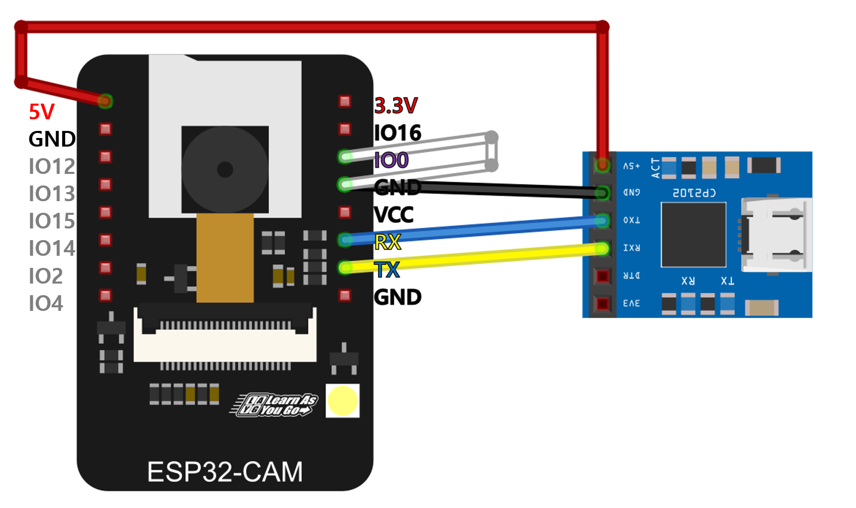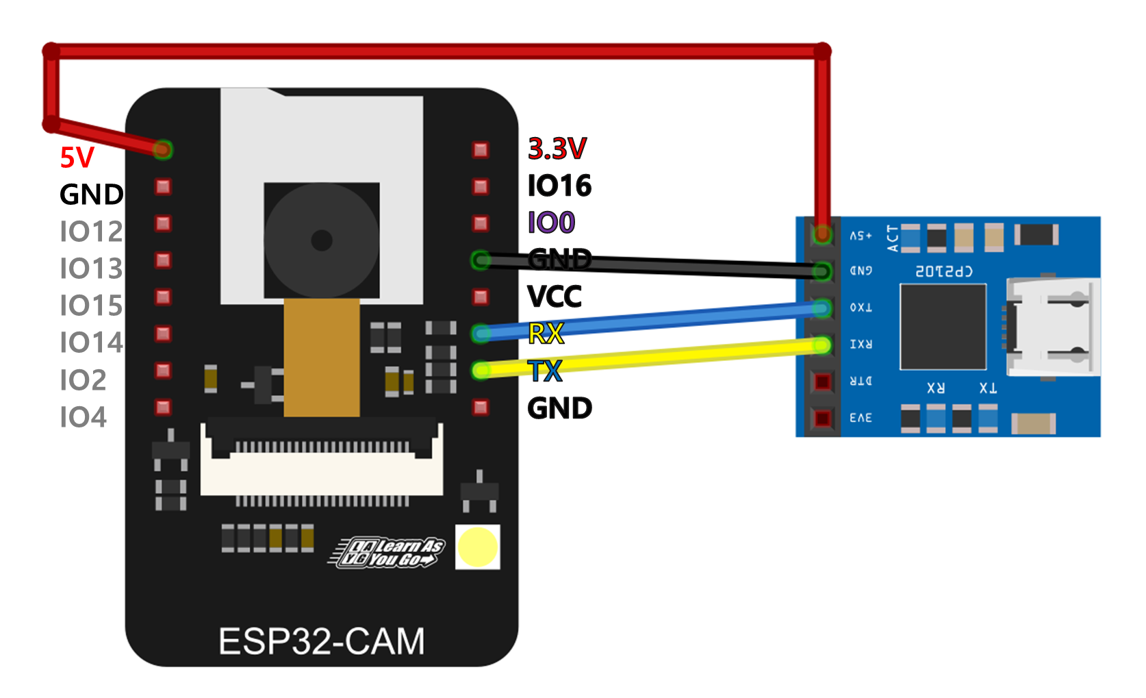 상태 확인 및 ESP32-CAM에 전원 인가를 위해 다음과 같이 연결합니다.