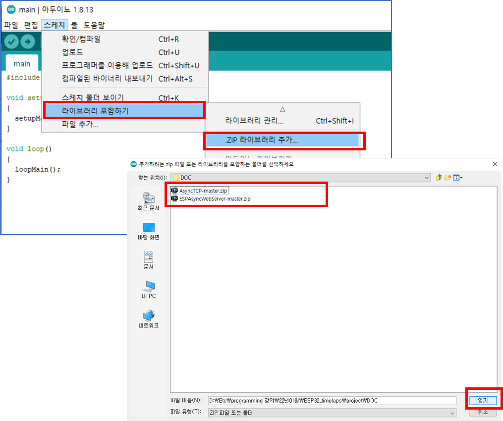 스케치 > 라이브러리 포함하기 > .ZIP 라이브러리 추가