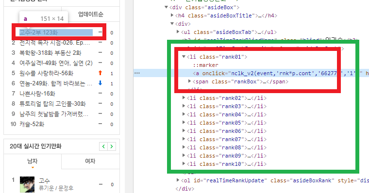 html에서 순위를 가지고 있는 부분의 class를 가져옵니다.