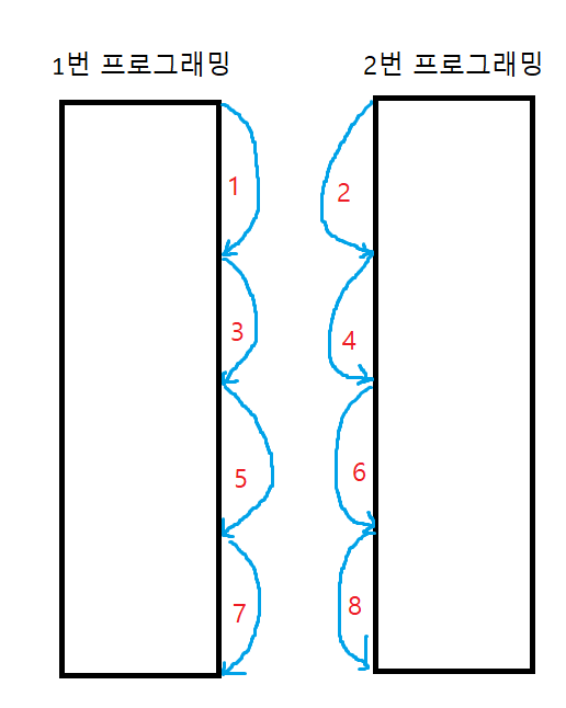 다음 그림과 같이 1개의 쓰레드로 실행하게 되면 1번을 다 처리하고 2번을 처리하겠지만